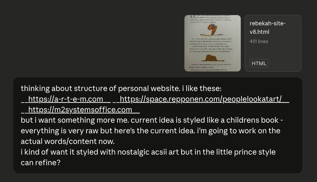 I wrote a whole chapter about making things with AI on the site. Go read it! It's the last section if you just want to skip right to it, and it's the most daring piece on there – in 2026, to publicly admit that I write with AI.