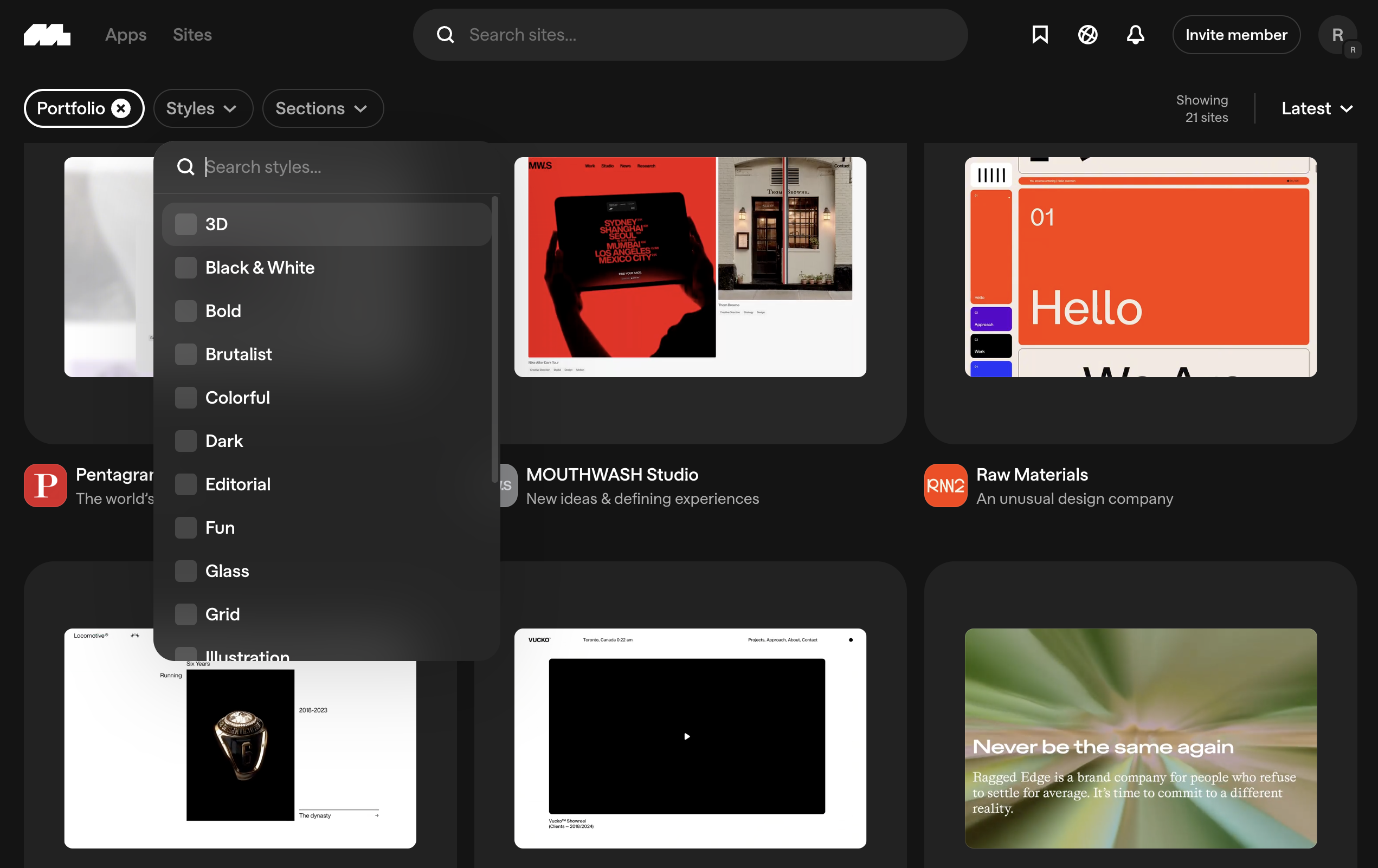 As one does, I started off strong: procrastinating in the name of research. With Mobbin, of course. I had the perfect excuse to spend hours looking at other people's personal sites and calling it "work." (It was genuinely SO useful though, to be able to search by style and section – saved me literal hours by shortcutting the what-do-i-like and what-do-i-definitely-not-want process.)