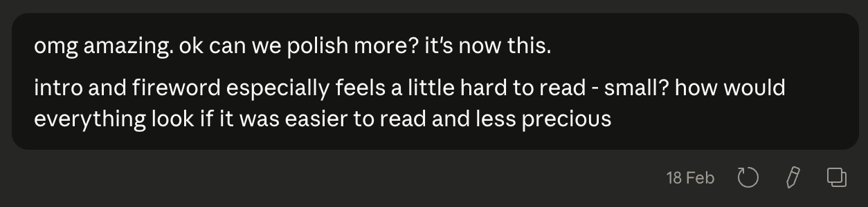 The font is too small. The interludes are hard to read. The cover feels too kiddy. The margins need a bit of oomph. The dark mode is all wrong. The cat icon looks like a marshmallow. Now the cat icon looks like an alien. Now the cat icon is cut off at the bottom.