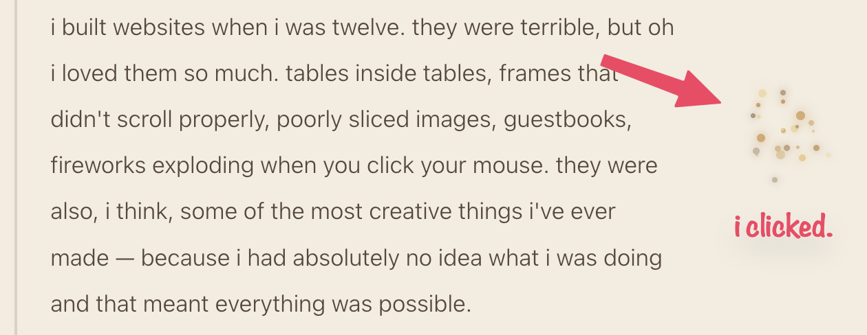 There's an easter egg in one of the interludes. Click around and you'll find it. I had fireworks on my Neopets page in 2004. I'm manifesting this comeback and you can't stop me.